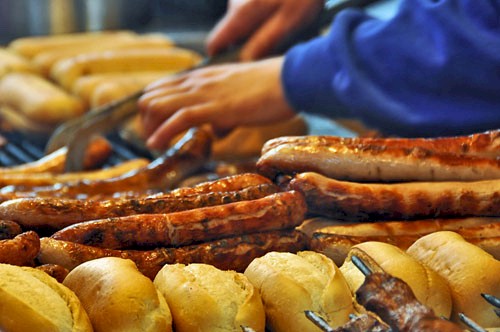 Grilling Bratwurst Schwenkgrill Click for video Schwenkgrill Carefully and continually turning the Bratwurst Click for video Assortment of Bratwurst and tasty German Style Hamburgers (pork, beef and seasonings) "Nuernberger Rostbratwurst being grilled. Note the traditionally short 5" length. "Haehnchen am Spiess"